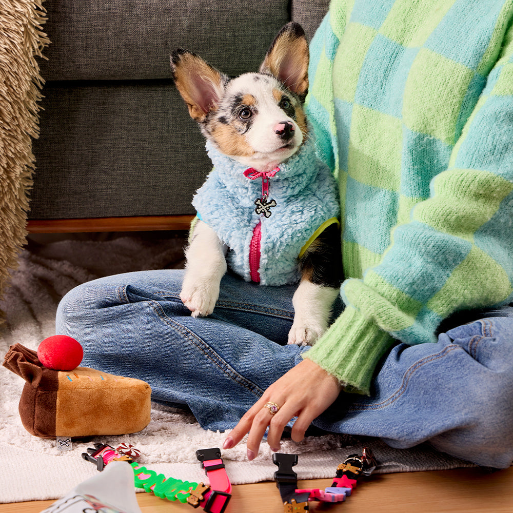 Tela tipo borrega por fuera y por dentro, ultra ligero y cómodo de usar. Cierre frontal con toque de color y logotipo en goma, bordes contrastantes para un look divertido, perfecto para días fríos. El abrazo más cálido que puedes darle a tu mascota, en forma de chaleco.